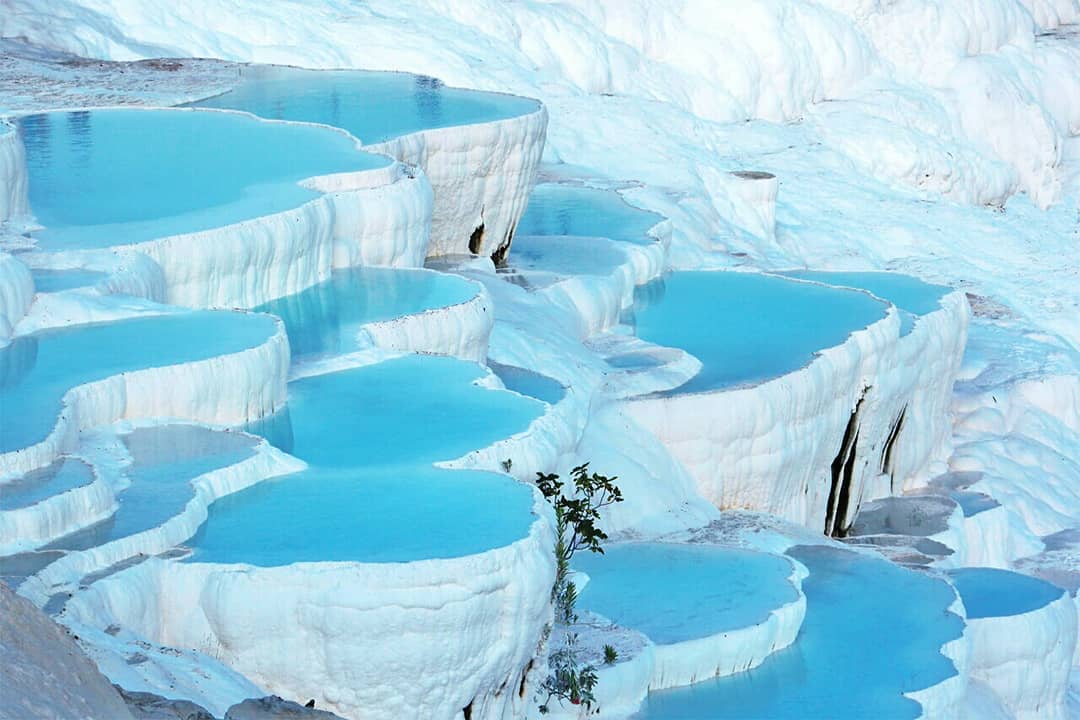 Tiếp tục đến với Pamukkale (~400km, ~5 giờ di chuyển) – Đây là một điểm đến hấp dẫn nhất nhì Thổ Nhĩ Kỳ bởi vẻ đẹp khó tin chỉ xuất hiện trong những bộ phim khoa học viễn tưởng của nó. Nếu chỉ nhìn trên ảnh hay những thước phim từ trên cao, người ta dễ nhầm lẫn đây là một núi tuyết khổng lồ nhưng thật ra đó chính là một vùng núi đá vô canxi cacbonic được tích tụ hàng nghìn năm.